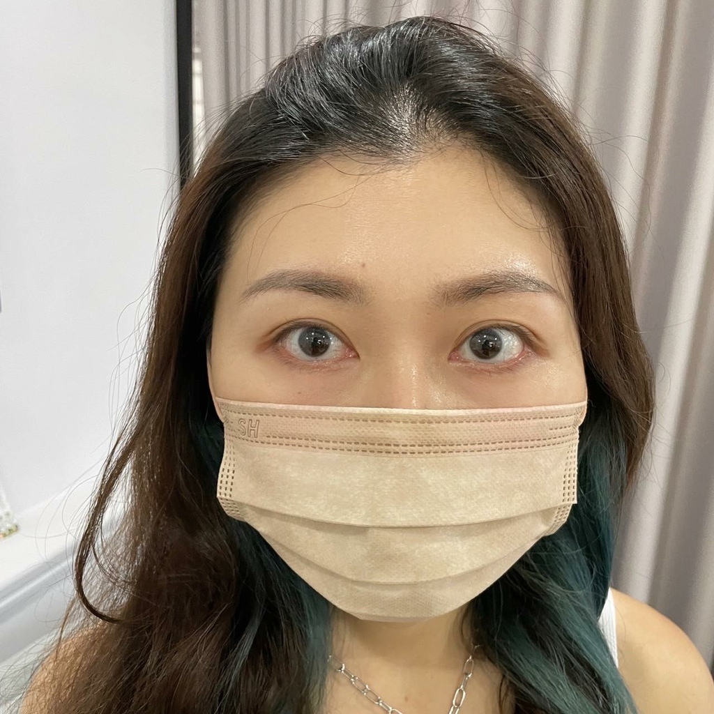 眼睛很大但兩眼高低有些落差,幫她調整水平後完成妝感眼線尾巴拉的尖尖型態很美喔!